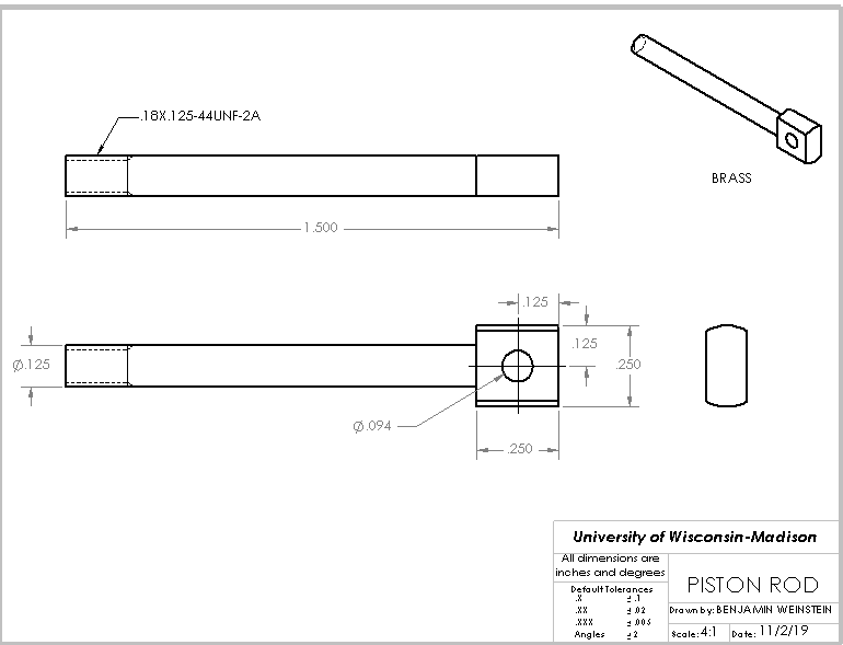 For this project, I was assigned to model a moving mechanism in Solidworks and then fabricate it using the resources available at UW-Madison. I chose to adapt a set of blueprints from Elmer’s Tiny Engines, then build it in the UW-Madison TEAM Lab.